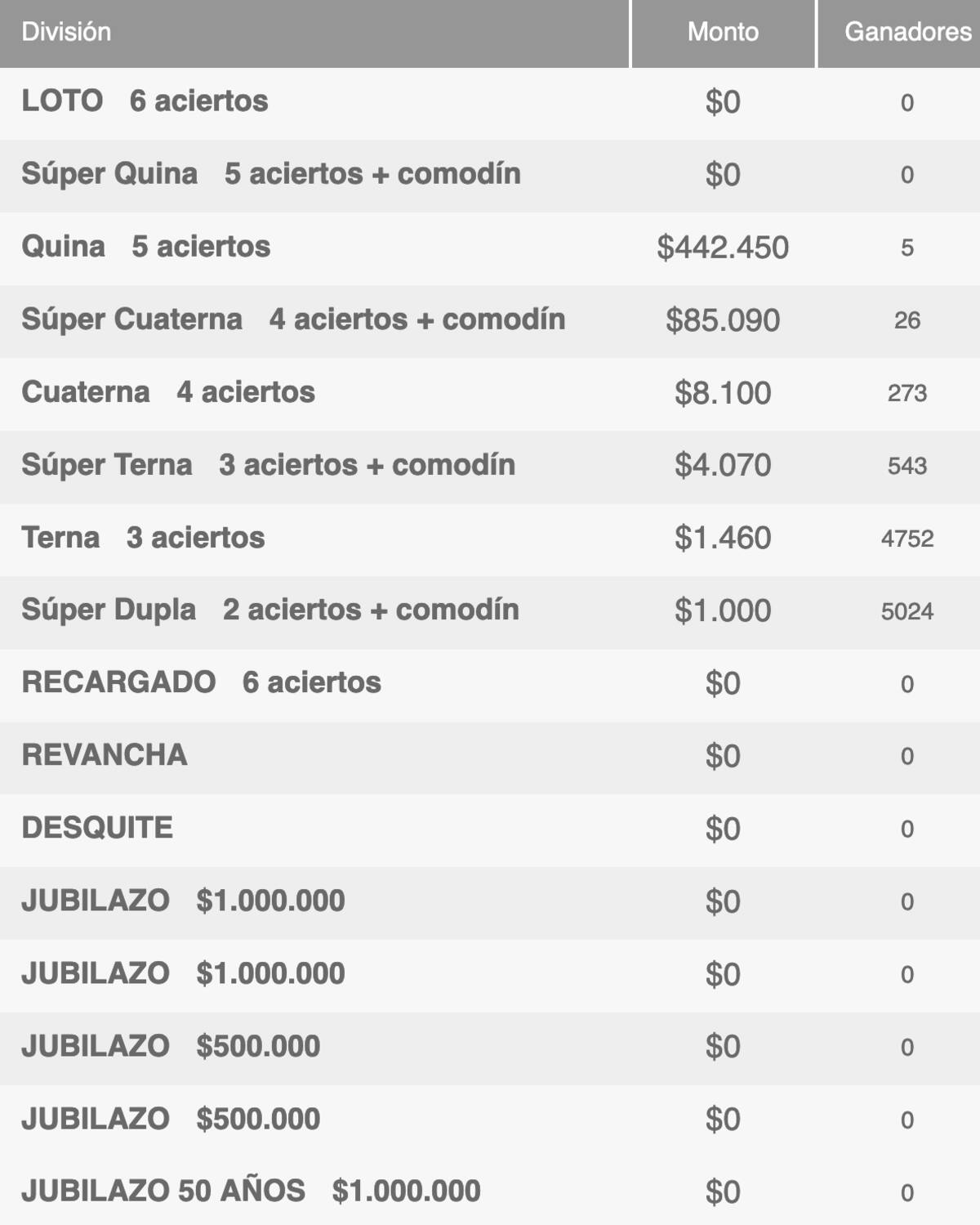 No se registró ningún ganador(a) en las siguientes categorías: Loto 6 aciertos; Recargado, Súper Quina 5 aciertos, Revancha, Desquite y Jubilazo $1.000.000, $500.000 y 50 años.