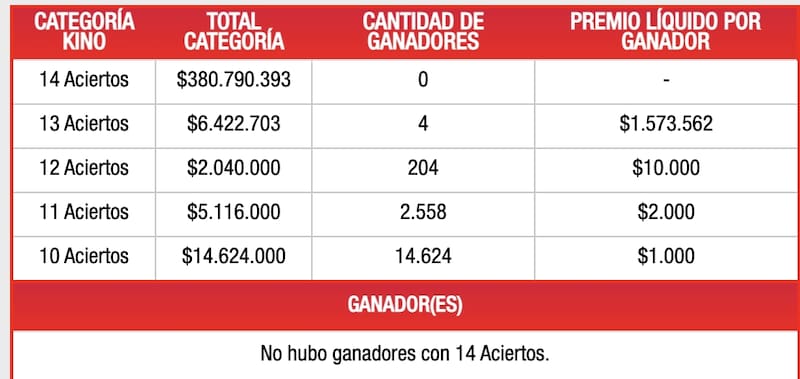 En el sorteo 2662 del Kino, nuevamente no hubo ganadores en la categoría 14 aciertos. Con 13 aciertos, se registraron 4 afortunados que se desembolsaron $1.573.562. Con 12 aciertos, hubo 204 ganadores, quienes recibirán $10.000. Para los 11 y 10 aciertos hubo más de 16 mil beneficiados, quienes tendrán un premio de dos mil o mil pesos.