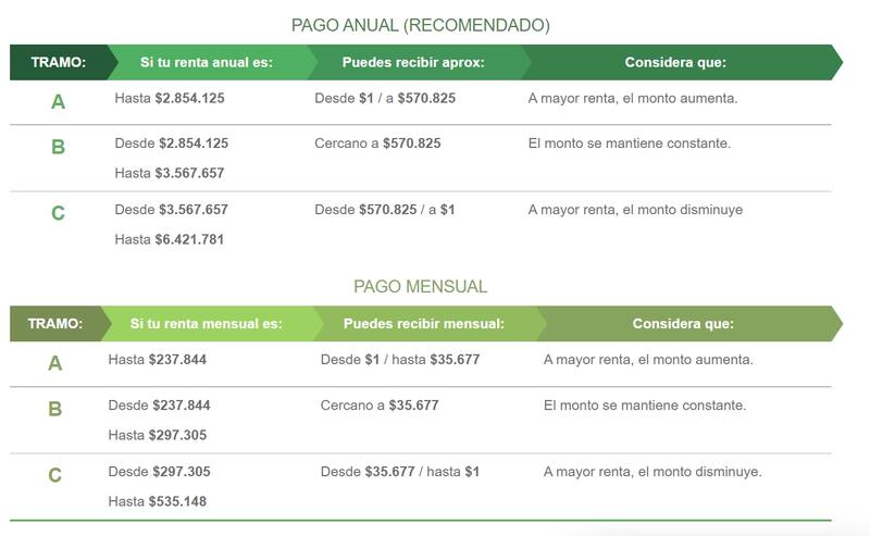 Pago mensual: no percibir una renta bruta mensual superior a $535.148.