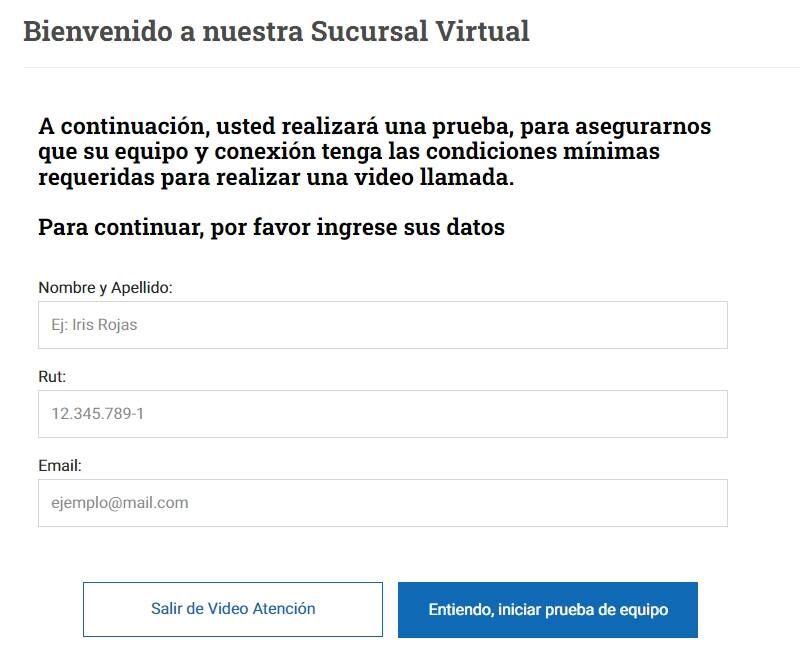 Entra a la Sucursal Virtual de Chile Atiende, completa los datos del formulario e inicia la prueba de equipo.