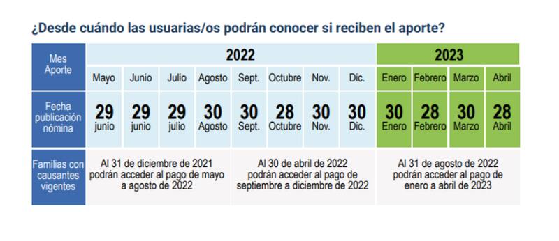 Si la persona tiene el Subsidio Familiar, Asignación Familiar o Maternal vigentes a agosto de 2022, recibirá el aporte mensual hasta abril de 2023.