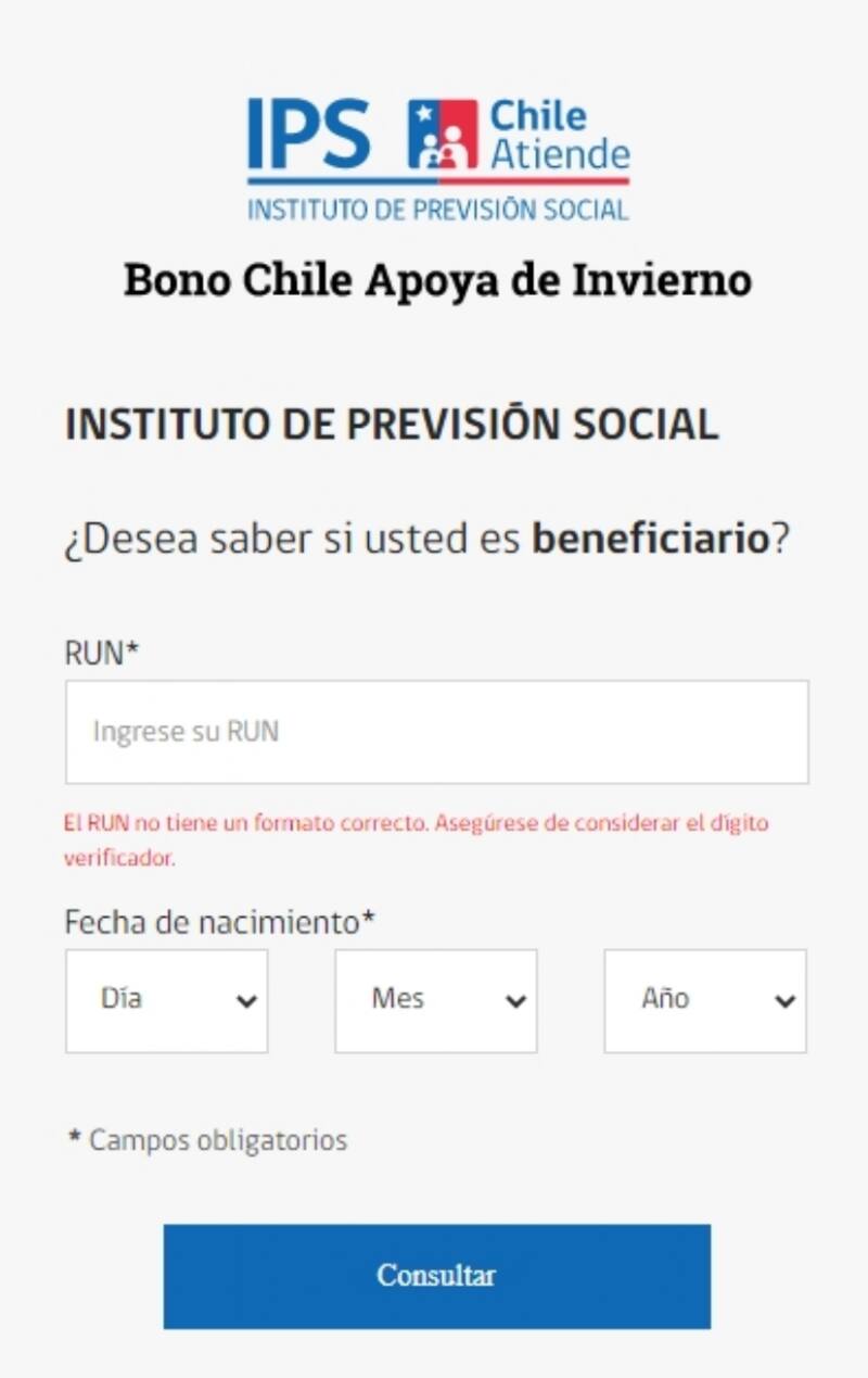En ese contexto, si deseas consultar si eres uno de los que no ha retirado su bono, puedes consultarlo a través sitio web del Bono Invierno. Solo debes ir a en "Consultar", ingresar tu RUT y fecha de nacimiento.
