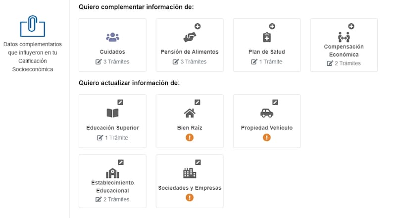 En la plataforma del RSH podrás modificar una serie de datos que te harán subir o bajar en el nivel de vulnerabilidad, entre los que se encuentran los "datos complementarios", donde encontrarás trámites como pensión de alimentos, que deberás completar si tu hogar recibe alguna, plan de salud, entre otros.