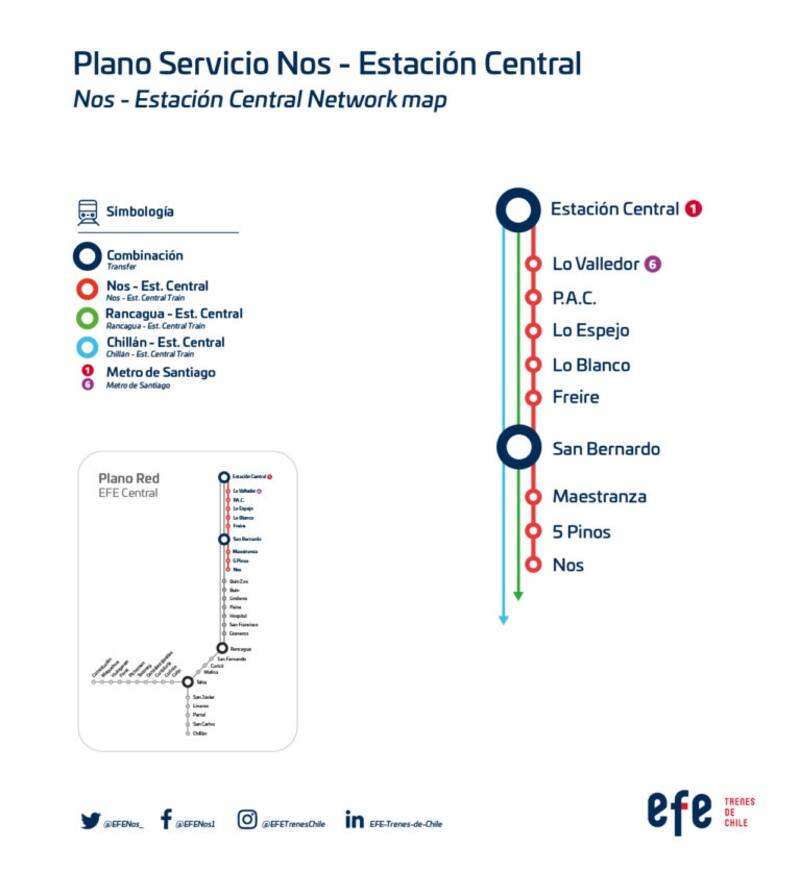 El Tren Nos - Estación Central lleva más de 5 años en funcionamiento, con una extensión de 20,8 kilómetros que conecta las comunas de Estación Central y San Bernardo en, aproximadamente, 25 minutos.