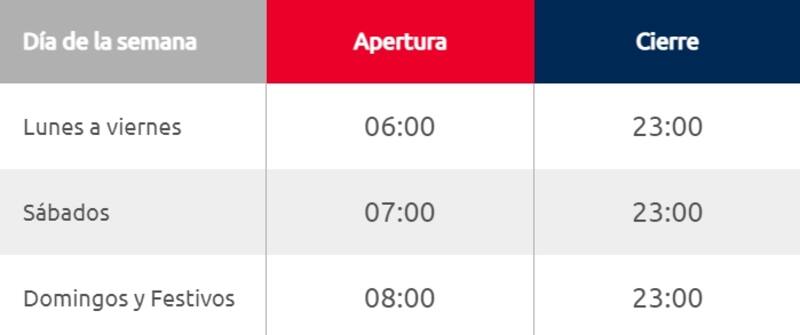 Domingo y festivos: estos días la apertura se realiza a las 8:00 am y el cierre es a las 23:00 horas.