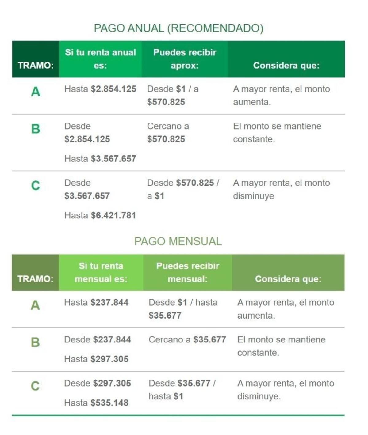 Por su parte, el monto del SEJ dependerá de la renta bruta que perciba el beneficiario o beneficiaria y se entrega en dos modalidades: anual y mensual.