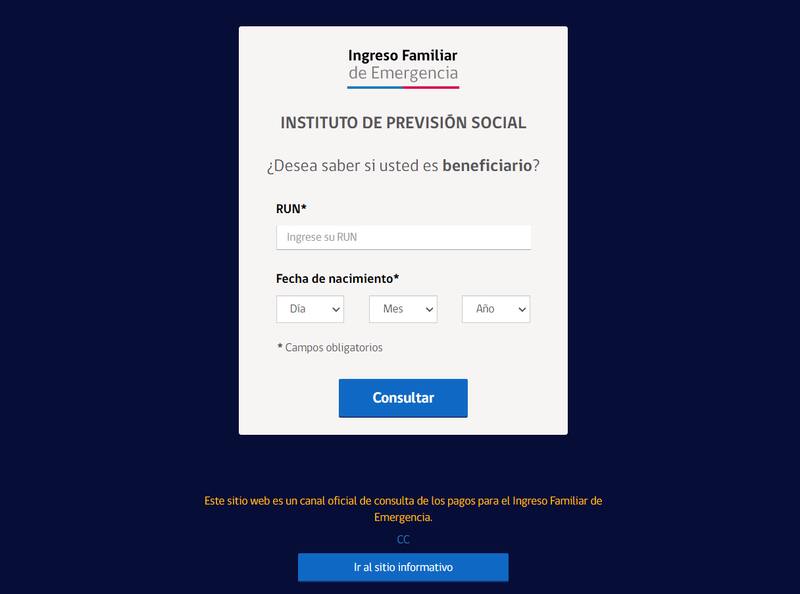 Las personas que deseen conocer si tienen pagos pendientes de este beneficio, podrán ingresar a la sitio oficial del IFE Universal. Allí solo deberán escribir su RUT y fecha de nacimiento, para luego seleccionar en "Consultar".