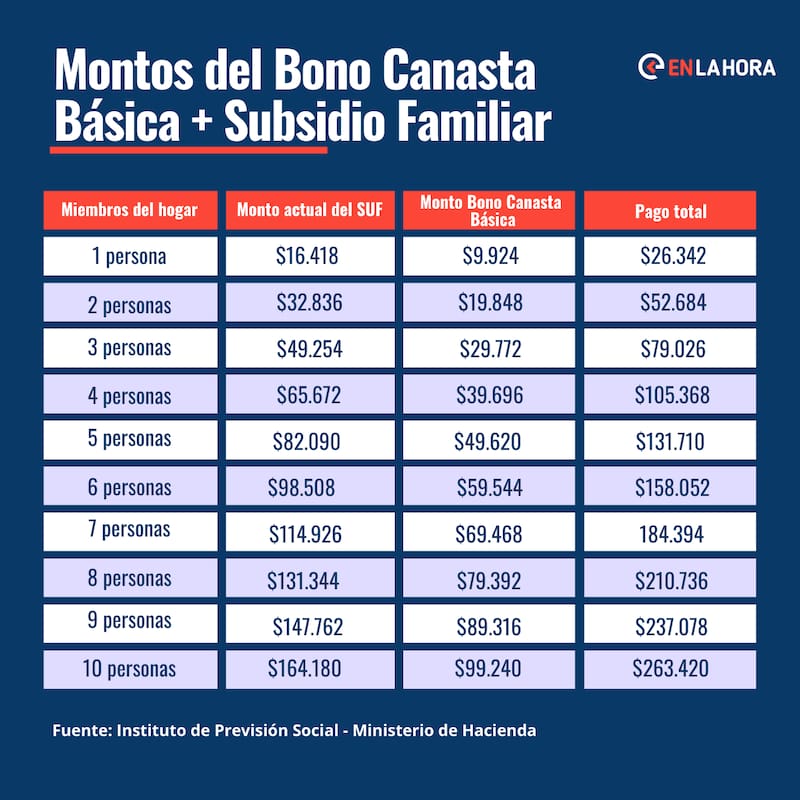 Es importante señalar que los pagos no tienen una fecha específica, sino que se entregan junto a los aportes mencionados, como por ejemplo, el Subsidio Familiar. A continuación te dejamos una tabla con los montos del Bono Canasta Básica sumados al SUF: