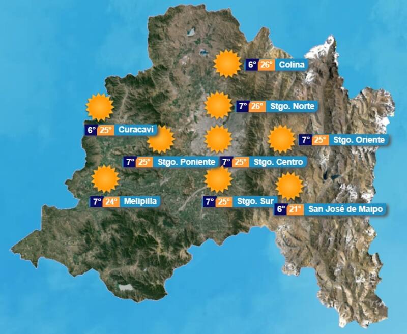 En tanto, la mínima en la capital será de 7°C, mientras que la máxima alcanzará los 26 grados en promedio, dependiendo del sector de Santiago.