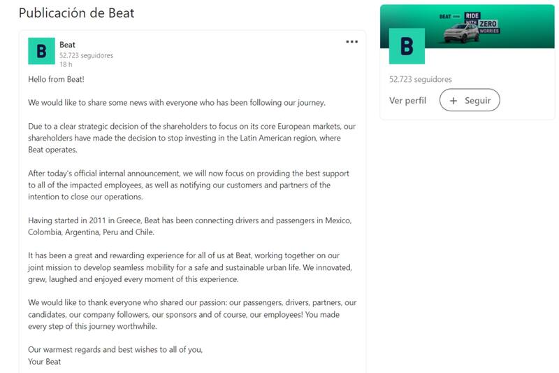 "Debido a una clara decisión estratégica de los accionistas de centrarse en sus principales mercados europeos, junto con el impacto de la pandemia en los patrones de movilidad en América Latina y la feroz competencia en curso, nuestros accionistas han tomado la decisión de dejar de invertir en la región de América Latina, donde opera Beat", expresaron.
