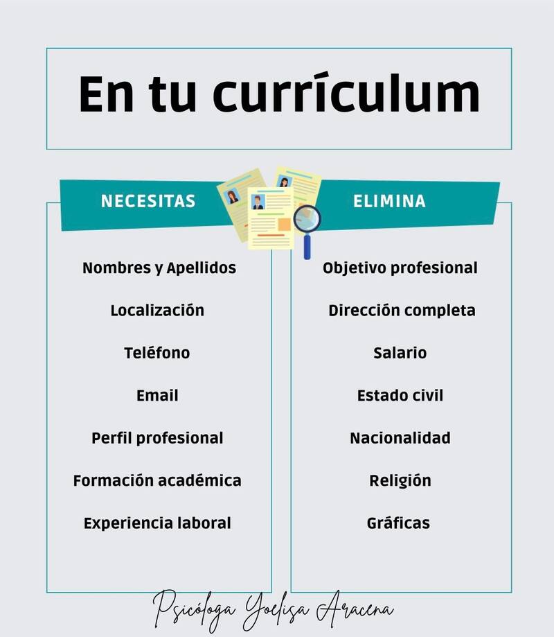 • Religión y Estado civil: no es información relevante para presentar en el CV y podría ocupar espacio necesario para otros datos.
