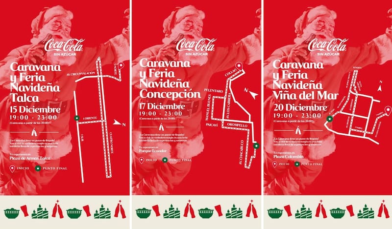 Hasta el 20 de diciembre estará en ruta la Caravana Navideña Coca-Cola 2022, pasando por Puente Alto, La Reina, Maipú, Renca, San Miguel/San Joaquín, Macul, Coquimbo, Viña del Mar, San Antonio, Talca y Concepción.