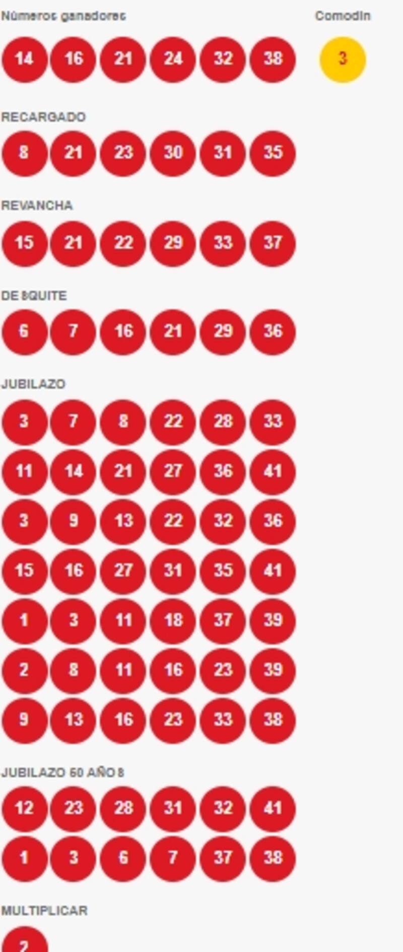 Números ganadores Loto: 14, 16, 21, 24, 32, 38