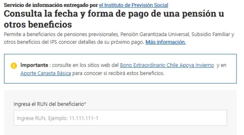 Las personas que deseen conocer la fecha y forma en que recibirán su aporte, pueden ingresar al sitio web de Chile Atiende y el IPS. Una vez dentro, las beneficiarias o beneficiarios deberán ingresar su RUT y seleccionar en "Consultar".