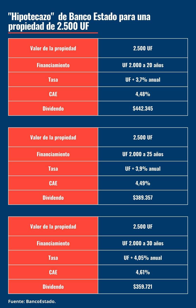 Si quieres conocer cómo sería un "Hipotecazo" para una propiedad de 2.500 UF (aproximadamente $87 millones), te mostramos tres ejemplos a continuación: