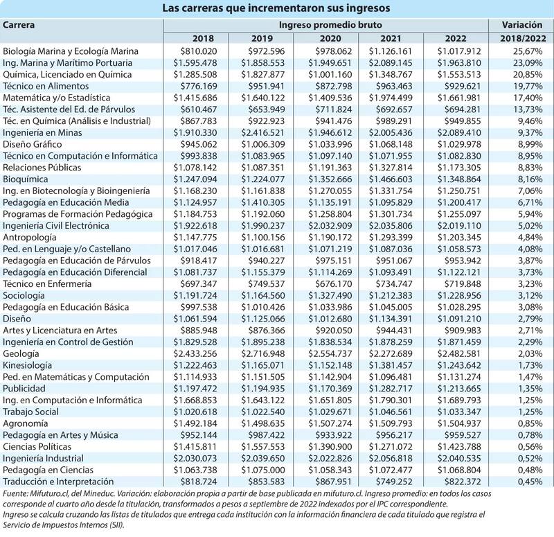 Bajo esto llega una tabla comparativa realizada por LUN en donde, gracias a datos del Mineduc, muestran la variación existente entre los sueldos de algunas carreras entre 2018 y 2022.