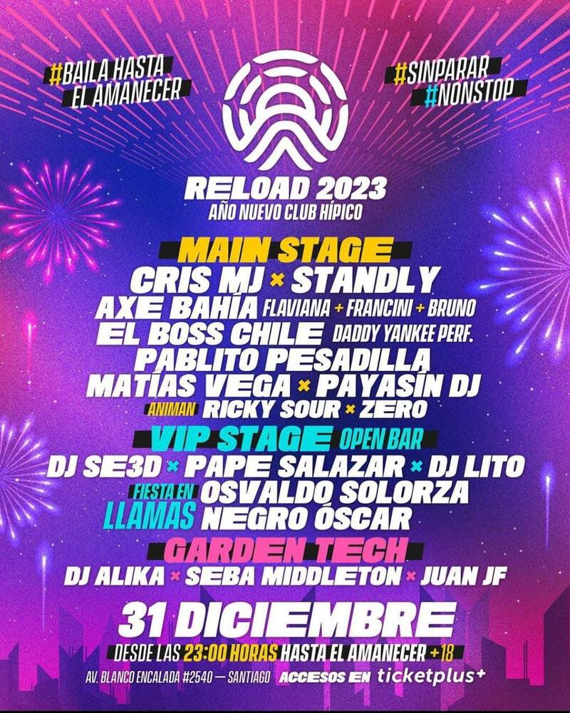 Otra fiesta que promete ser una de las más prendidas de la Región Metropolitana es Reload 2023, un evento que se desarrollará en el Club Hípico y contará con tres escenarios: Main Stage, Vip con bar abierto y Garden tech.