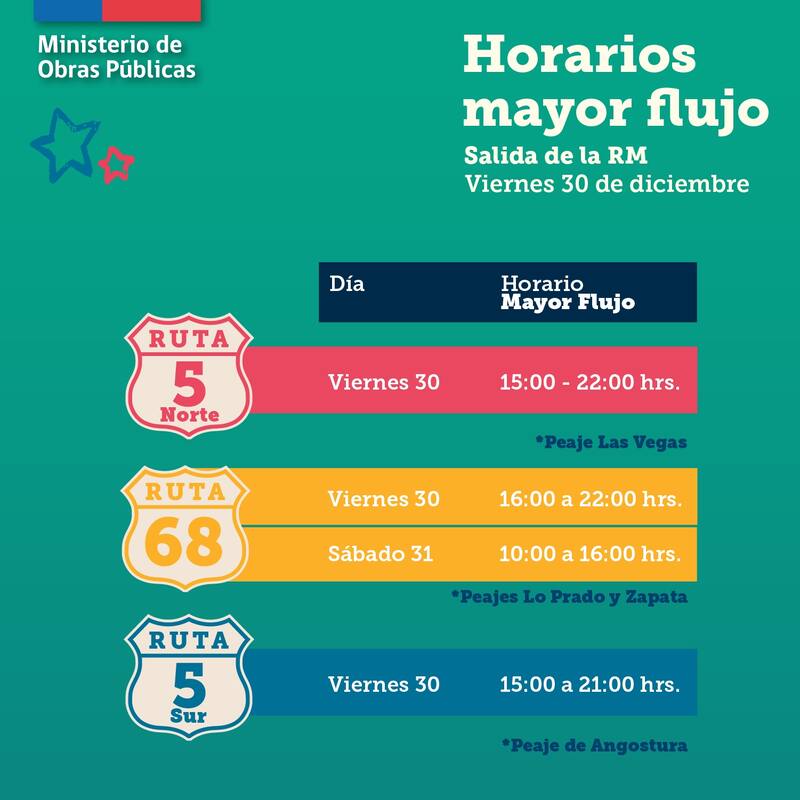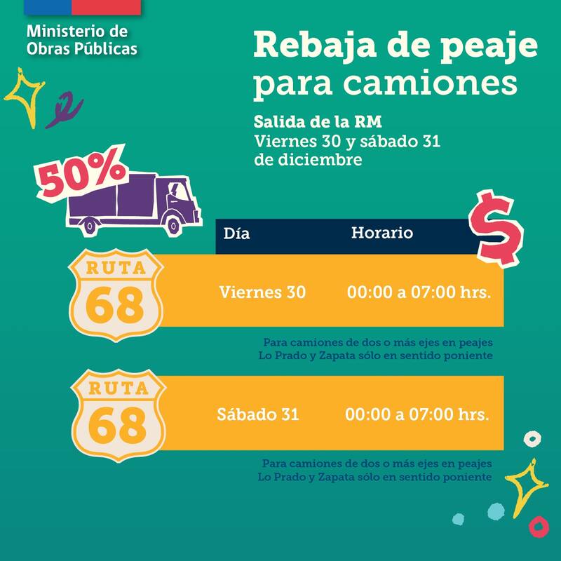 El sábado 31 de diciembre también habrá peaje rebajado en 50% para los camiones de dos o más ejes en la Ruta 68 entre las 00:00 y 07:00 horas. A su vez, habrá restricción del paso de camiones de 2 o más ejes entre Vespucio (km 6,2) y el enlace Algarrobo (km 68) en dirección hacia el poniente, entre las 9:00 y 16:00 horas.