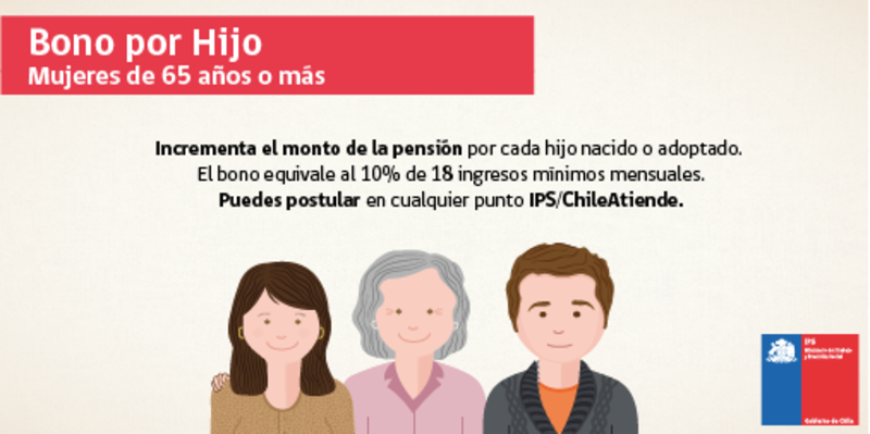 El Bono por Hijo es un beneficio del Estado que se entrega a mujeres pensionadas desde 65 años de edad por cada hijo nacido vivo o que haya sido adoptado. Además, el aporte se generará tanto para la madre biológica como para la madre adoptiva.