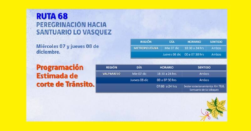 Para celebrar a la Inmaculada Concepción se realizan misas a lo largo de todo Chile, pero además las personas llevan a cabo diversas peregrinaciones hacia el santuario de Lo Vásquez, motivo por el que se cortó la Ruta 68 los días miércoles 7 y jueves 8 de diciembre.