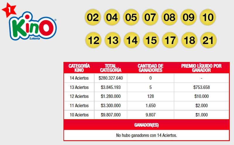 No se registró ningún ganador en la categoría de 14 aciertos de Kino, tampoco en ReKino, Chanchito Regalón, Combo Marraqueta y Chao Jefe.