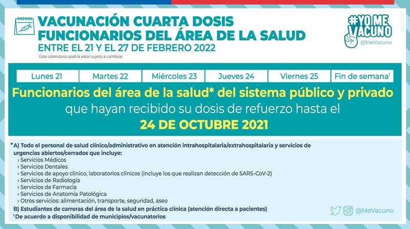Además, corresponde la vacunación con la cuarta dosis para todo el personal de salud que haya recibido su primera dosis de refuerzo hasta el 24 de octubre del 2021. Esto incluye a: