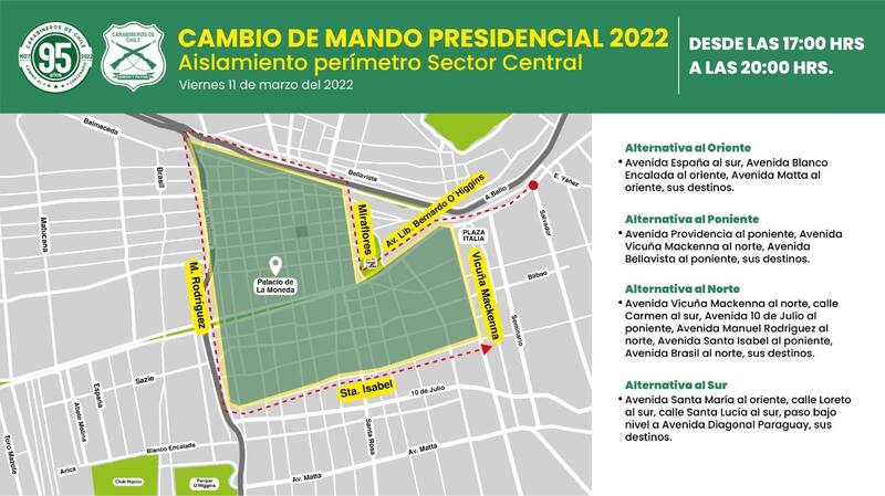A las 18:00 horas Gabriel Boric realizará en Santiago su primer discurso oficial como Presidente en ejercicio, por lo que también se han tomado medidas de tránsito al respecto. Desde las 17:00 hasta las 20:00 horas, este será el perímetro y las calles sin movimiento: