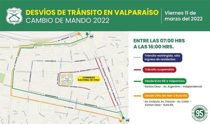 Este viernes 11 de marzo se realiza el cambio de mando, donde el actual Presidente Sebastián Piñera hará entrega del cargo al Mandatario electo, Gabriel Boric. Debido al gran movimiento que ello implica, desde el Gobierno y Carabineros informaron sobre cortes de tránsito en diferentes calles de Santiago y Valparaíso.