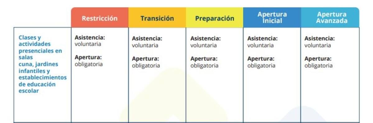 De acuerdo a este documento que comenzó a circular en redes sociales y que se tomó como cierto, la asistencia a clases volvería a ser voluntaria en las cinco fases del Plan Paso a Paso: Restricción, Transición, Preparación, Apertura Inicial y Apertura Avanzada.