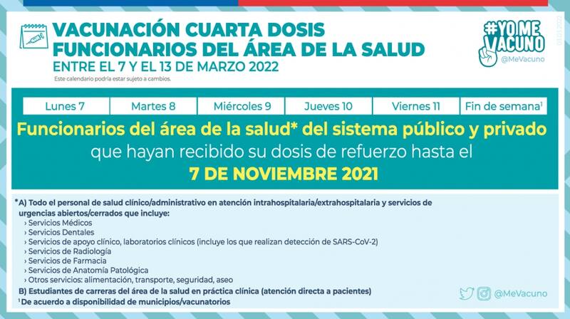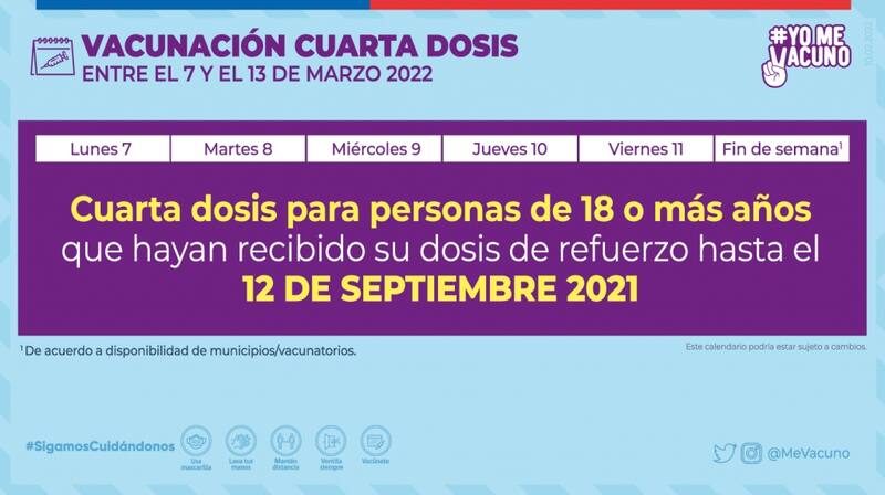 Junto con esto, las personas que actualmente estén con tratamiento relativo al sistema inmune también pueden solicitar su cuarta dosis en cualquier centro de inoculación del país, habiendo recibido su dosis de refuerzo al 7 de noviembre del 2021, presentando un certificado de su tratamiento u condición médica en caso de ser trasplantado, junto a su carnet sanitario y de identidad.