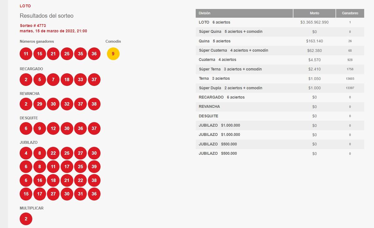 Sin embargo, una persona se llevó el premio más importante: el Loto 6 aciertos, quedándose con un monto total de $3.365.962.990.