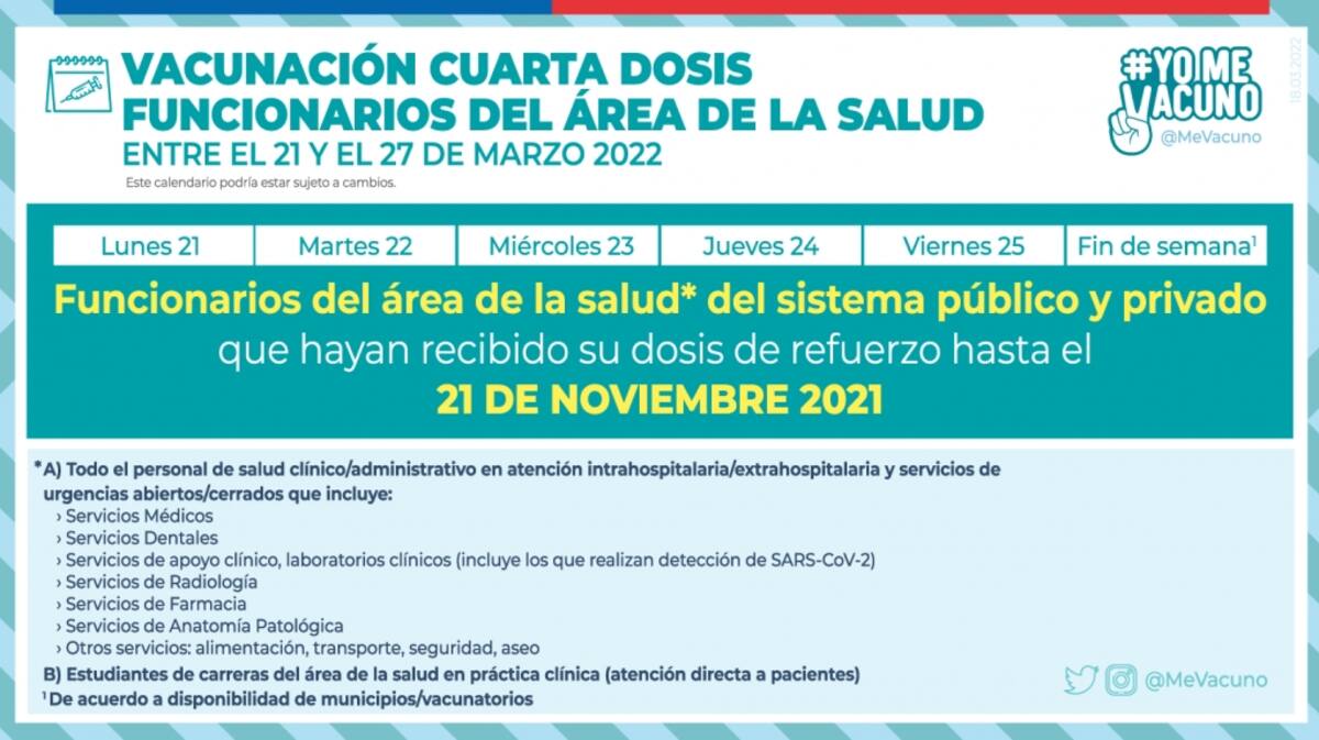 Desde este lunes 21 de marzo pueden recibir su cuarta dosis funcionarios(as) del área de la salud del sistema público y privado que hayan recibido su dosis de refuerzo hasta el 21 de noviembre.