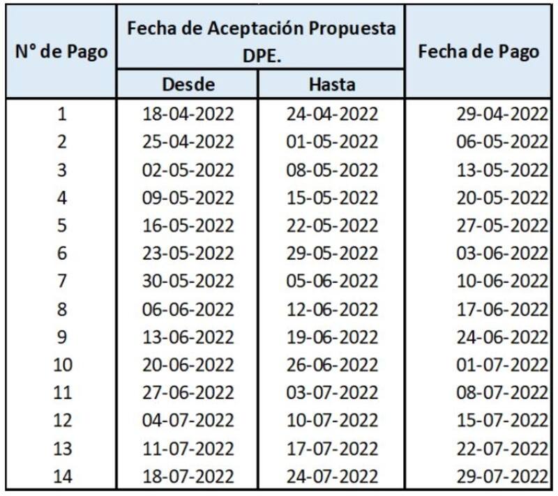 El pago podrá ser recibido en un plazo que varía entre 5 a 10 días hábiles, según la fecha en que se haya aceptado la propuesta y de acuerdo con el siguiente calendario de pagos:
