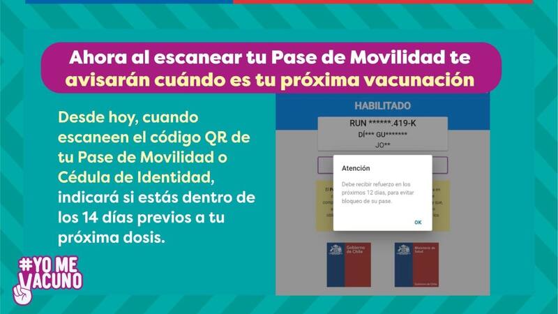 Además, la autoridad sanitaria explicó que desde este martes la función que escanea y valida los Pases de Movilidad informará, por medio de una alerta, cuando falten 14 días para el momento en que el usuario se debe aplicar su dosis de refuerzo.