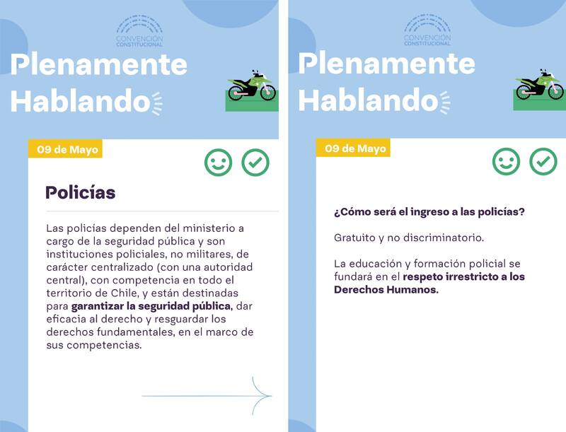 En ese contexto, la instancia dio luz verde a un grupo de normas respecto al rol de las policías, despachando al borrador de la nueva Constitución que éstas "dependen del ministerio a cargo de la seguridad pública y son instituciones policiales, no militares, de carácter centralizado, con competencia en todo el territorio de Chile".