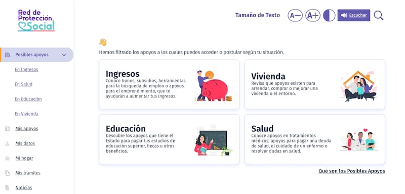 - Una vez que ingreses, verás las distintas áreas donde puedes recibir apoyo del Estado.