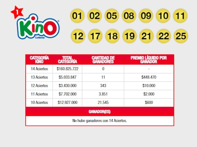 Como se mencionó anteriormente, no se registró ningún afortunado en la categoría de 14 aciertos del Kino. Sin embargo, sí hubo 11 personas que ganaron con 13 aciertos, quienes recibirán $448.470 cada uno. También hubo 343 afortunados en la subcategoría de 12 aciertos, los que ganaron $10.000. Mientras que con 11 y 10 aciertos, más de 25 mil personas recibirán entre $2.000 y $600.