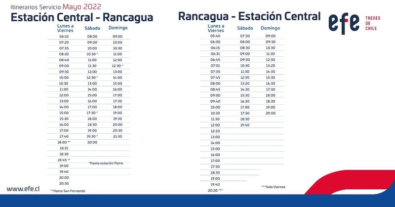 Cabe destacar que las frecuencias del Tren Rancagua-Estación Central son cada treinta minutos hacia Rancagua en hora punta y cada una hora en horario normal, conectando la Región Metropolitana con la Región de O'Higgins.