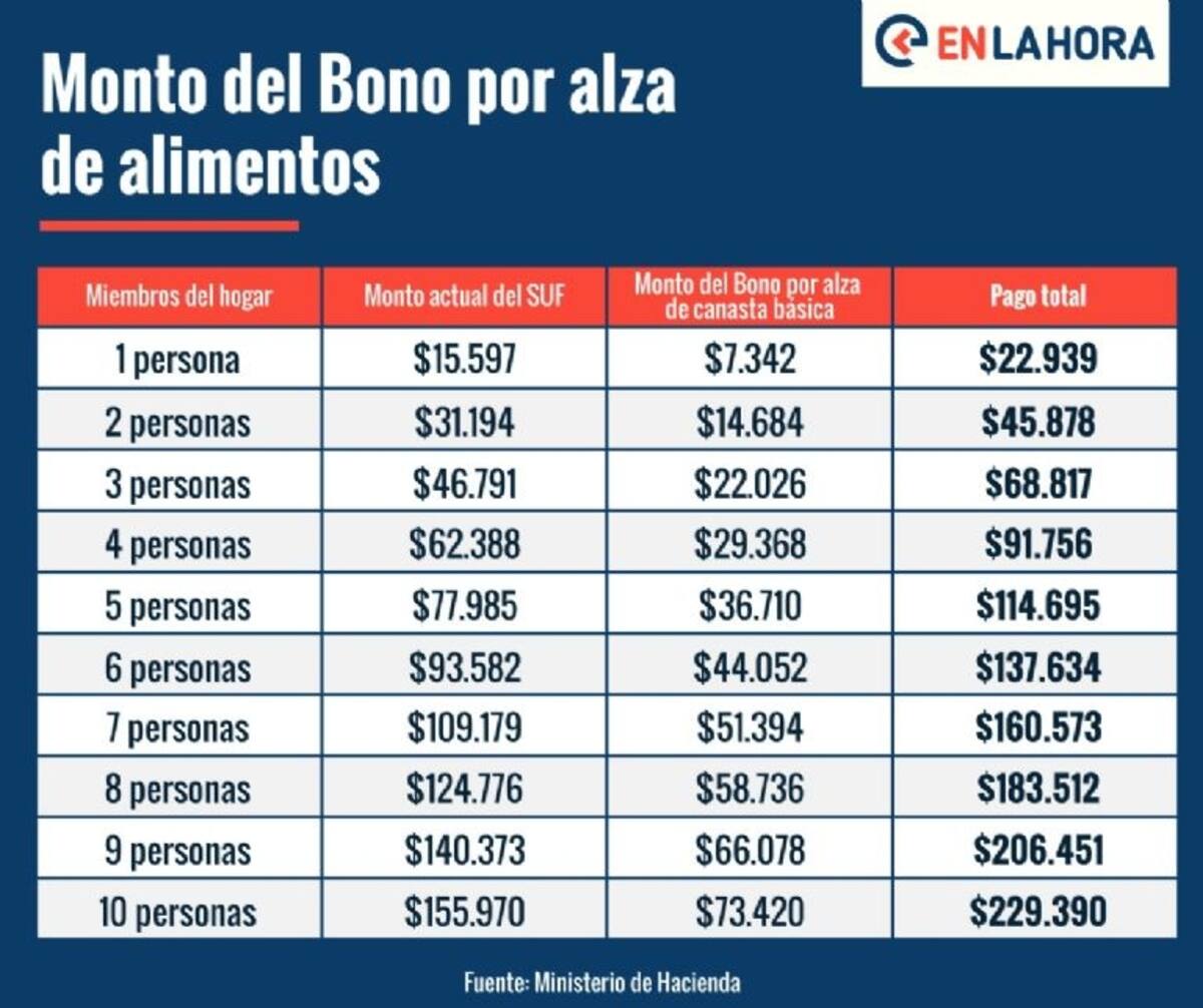 Esta última parte de la iniciativa busca ayudar a las familias para que puedan enfrentar el alza de precios producto de la Inflación. En detalle, este bono entrega un aporte de $7.342 por carga familiar, valor que se debe al último reajuste que tuvo el IPC en abril, incrementando en un 1,4%.