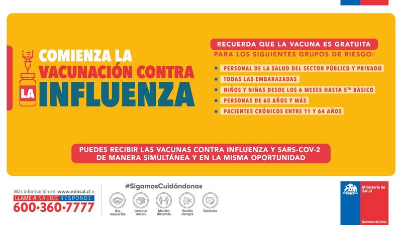Este sábado 28 de mayo continúa la campaña de vacunación contra la influenza, inoculación que es comandada por el Ministerio de Salud y que se entrega de manera gratuita para quienes pertenezcan a los grupos de riesgo, y para lo cual solo es necesario presentar el carnet de identidad, al igual que con el proceso de vacunación contra el Covid-19, que se desarrolla de forma paralela.