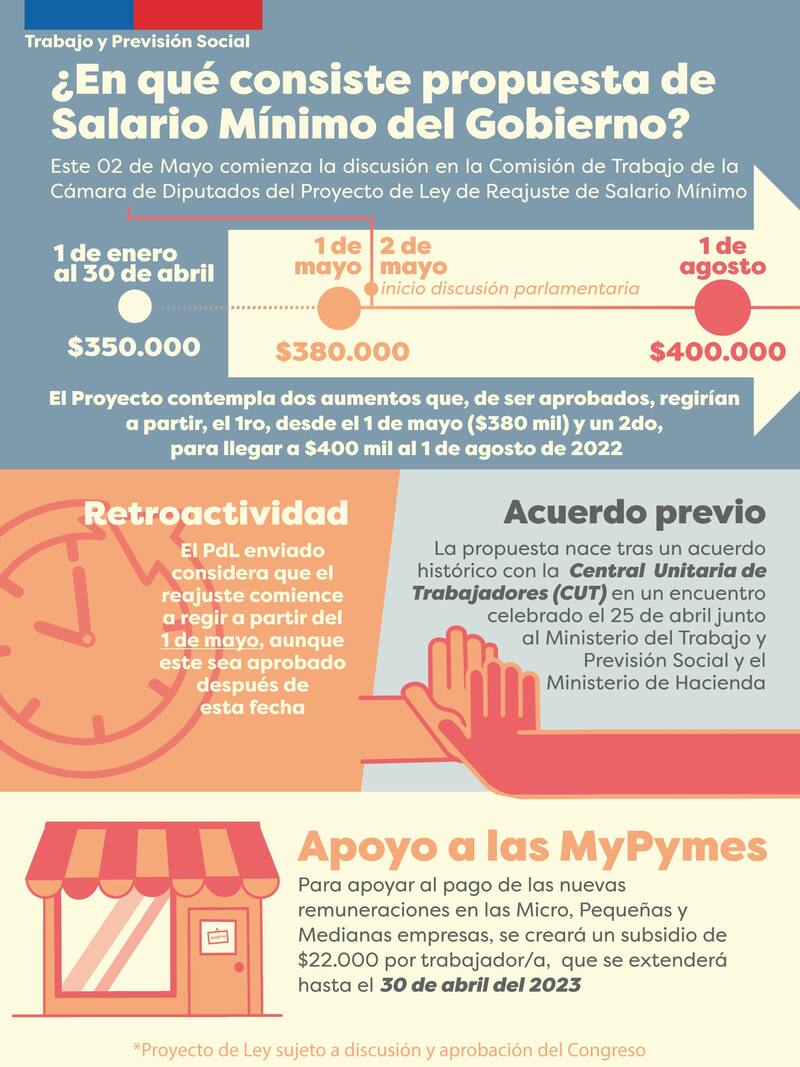 De acuerdo al proyecto del Gobierno, "la primera alza del sueldo mínimo será de $30.000, razón por la cual los salarios alcanzarán los $380.000. Ese incremento comenzó a regir el 1 de mayo, aunque su pago podría ser retroactivo.
