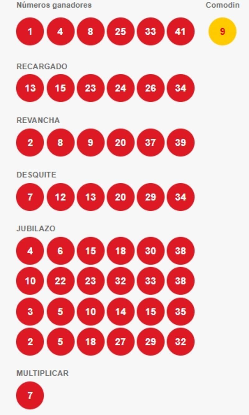 - Números ganadores: 01, 04, 08, 25, 33, 41.