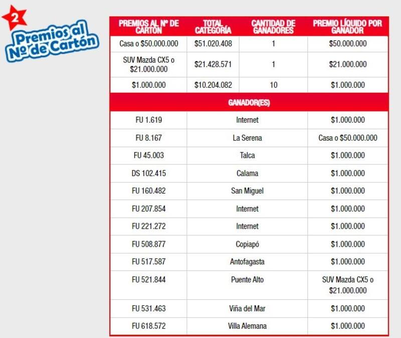 - Premios al N° del Cartón: FU 1.619, FU 8.167, FU 45.003, DS 102.415, FU 160.482, FU 207.854, FU 221.272, FU 508.877, FU 517.587, FU 521.844, FU 531.463, FU 618.572.