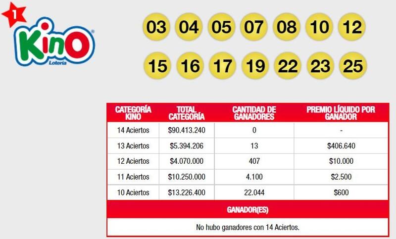 Sin embargo, sí hubo 13 personas que ganaron en Kino 13 aciertos, quienes recibirán $406.640 cada uno. También hubo 407 ganadores en la subcategoría de 12 aciertos, por lo que se embolsarán $10.000. En las de 11 y 10 aciertos, más de 26 mil personas recibirán $2.500 y $600, respectivamente.