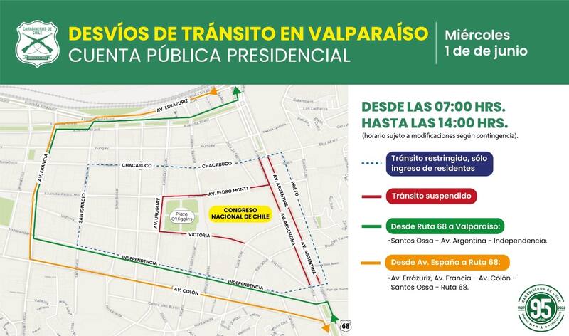 Además, el Terminal de Buses de Valparaíso se encontrará cerrado, por lo que Carabineros llamó a quienes deben viajar ese día a consultar en las respectivas líneas de buses sobre los puntos de salida.