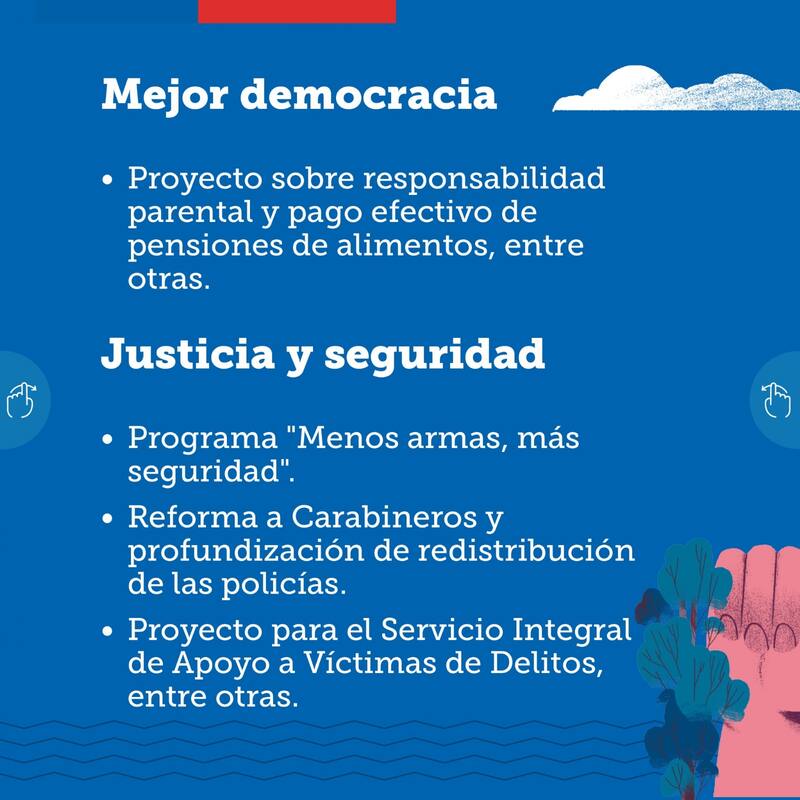 Respecto a la violencia armada, señaló: "Nuestro Programa Menos Armas, Más Seguridad propone la limitación radical de su acceso legal. Desde ya, 21 solicito a este honorable Congreso todo el apoyo para aprobar una Ley que nos permita avanzar hacia la prohibición total de tenencia de armas y que al mismo tiempo fortalezca la institucionalidad a cargo de la fiscalización".