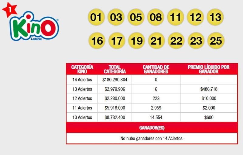 Además, hubo seis personas que con 13 aciertos en Kino se llevaron $486.718 cada uno; 223 se quedaron con $10.000 en la categoría de 12 aciertos. En la de 11 aciertos, un total de 2.959 se embolsaron $2.000 y 14.554 personas con 10 aciertos recibirán $600.