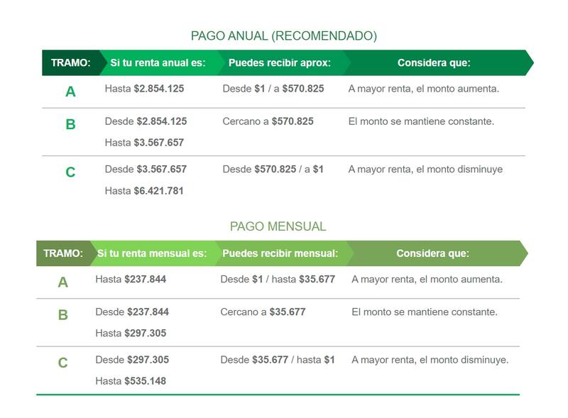 Es posible solicitar la opción anual si el ingreso bruto al año del beneficiario es menor a $5.858.600, mientras que si se prefiere la entrega mensual, el ingreso al mes debe ser menor a $488.200.
