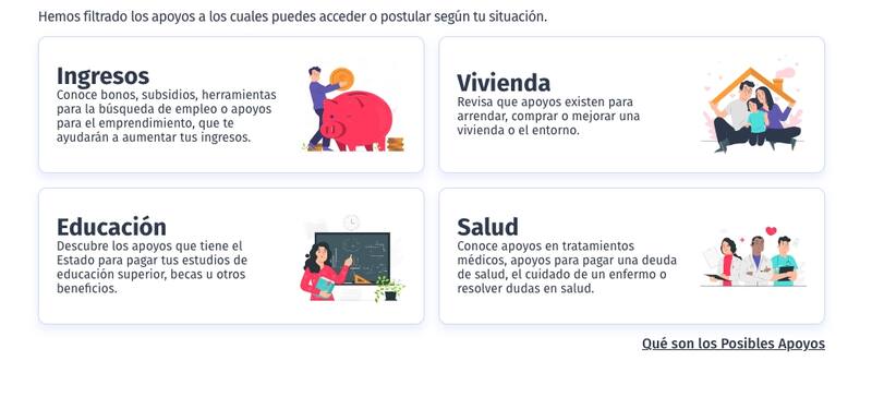 Si eliges el RUT, tendrás que contar con tu cédula de identidad, ya que el sitio te solicitará digitar el número de documento. Cuando accedas, podrás ver en el apartado de "Posibles apoyo" unos recuadros con los temas de Salud, Vivienda, Ingresos y Educación. Según informa el sitio, allí aparecerán "los apoyos a los cuales puedes acceder o postular según tu situación".