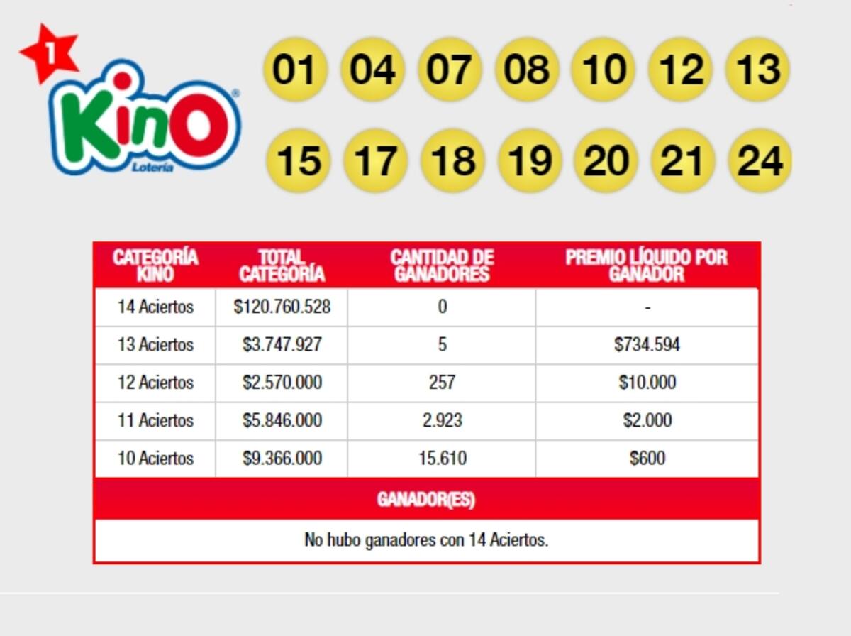 Como se mencionó anteriormente, no se registró ningún afortunado en la categoría de 14 aciertos del Kino. Sin embargo, sí hubo 5 personas que ganaron con 13 aciertos, quienes recibirán $734.594 cada uno.
